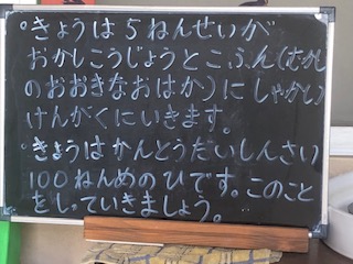 ◯今日は5年生が社会見学に行きます。お菓子工場と古墳を見学してお弁当を食べて帰ってきます。