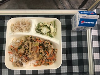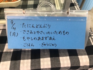 今日の給食は、他人丼でした。給食カレンダーには、丼の種類について詳しく書かれています。