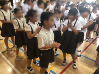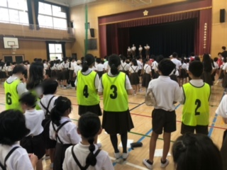 リーダーが物の名前を言っていきます。文房具店で売っている物の時は手をたたきます。売っていない物の時はたたきません。「えんぴつ、消しゴム、ふでばこ」は、たたきます。時々、「消しかす」「テレビ」というので、たたいてしまうと座ります。