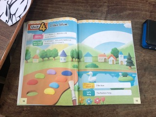 今日は英語で好きな色を話しています。虹の絵に好きな色をぬっています。