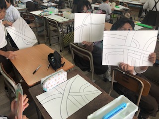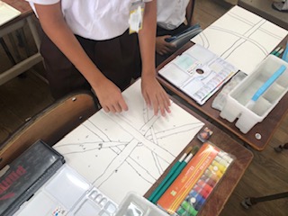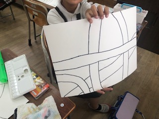 3年生が描いた絵を見せてくれました。これから絵の具で色を塗っていきます。