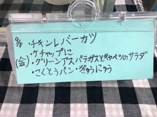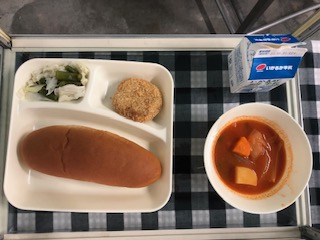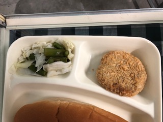 今日の給食には、チキンレバーカツがでました。パンは黒糖パンです。