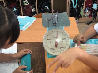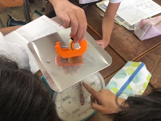 教室にはかりを持ち込み、実際に重さを計っていきます。子どもたちは「セロテープは◯グラム、筆箱は◯グラム」という具合に興味を持って取り組んでいます。