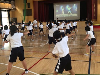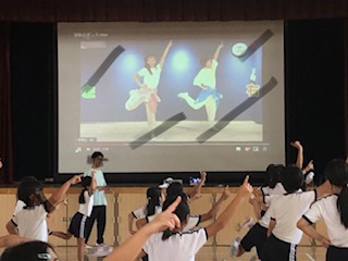 大きなスクリーンに見本の映像を映してダンスの練習をしています。(スクリーンの映像は加工しています)