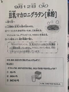 今日の給食のマカロニグラタンには米粉が使われています。みかんの缶詰もつきました。