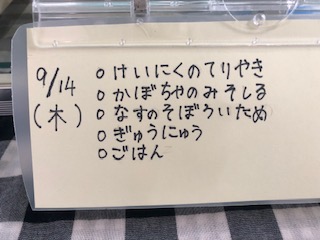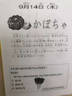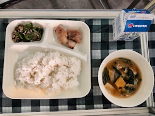 今日の給食の味噌汁には、かぼちゃが入っています。鶏肉の照り焼きも好評でした。