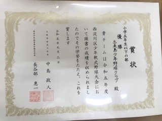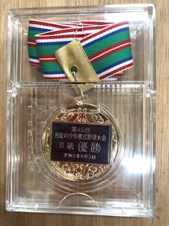 今日の朝会では、軟式野球チームの表彰をしました。メダルもかけました。