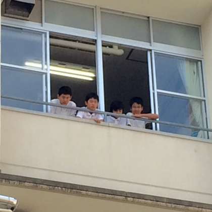 4階の窓から6年生が様子を見て応援しています。