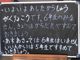 明日から修学旅行となります。6年生がたくさんの体験をして、すてきな思い出を刻めるよう、健康を大事にしていきたいと思います。