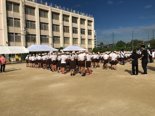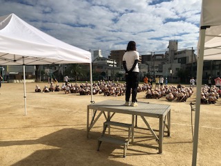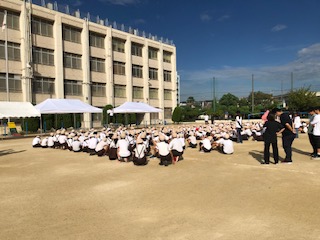 先週に比べて朝会の時の暑さはおさまってきていますが、修学旅行後の6年生の疲れなどを考慮して子どもたちを座らせて行いました。