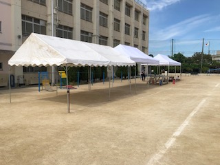 運動会まであと3週間となりました。練習も本格的に進められていきます。運動場にはテントを立て、子どもたちの休憩などに活用しています。