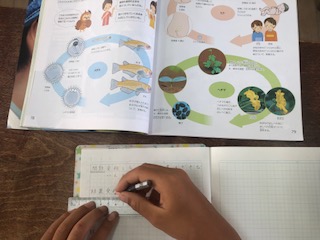 花から実の授業では、今まで学習してきたメダカなどをふりかえりながら進めていました。