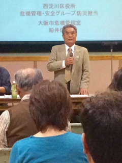 大和田地域活動協議会田中会長の挨拶のあと、西淀川区役所松井防災担当係長様、大阪市危機管理室船井アドバイザーより説明があります。