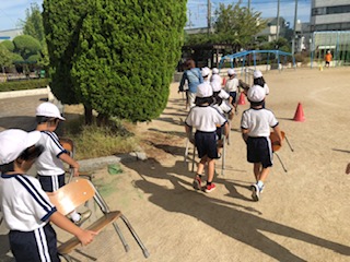 今日は運動場に椅子を並べました。子どもたちが椅子を持って割り当てられた場所へいきます。