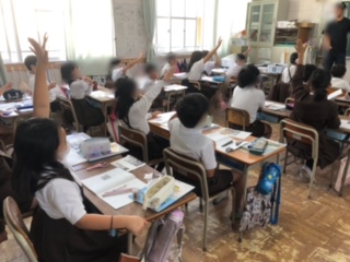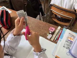 形の違う四角形の面積を比べていきます。紙を切って考えています。