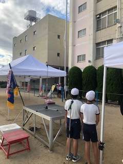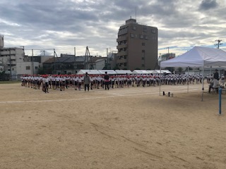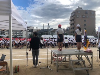 児童朝会に続いて全体練習をしました。開会式、閉会式を中心に行いました。写真下はラジオ体操のために広がっているところです。