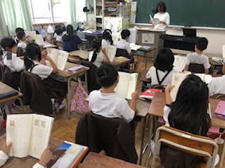 教科書を持って声をそろえて読んでいます。