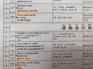 月のカレンダーには、16日が運動会代休で給食がないことが記載されています。