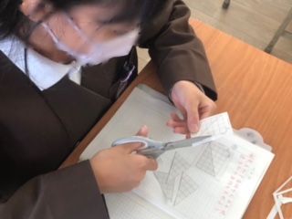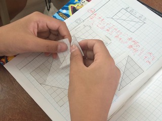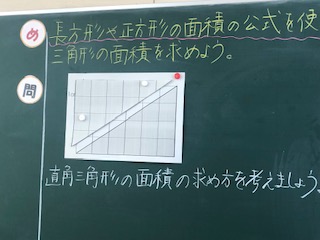今日は三角形の面積の求め方を正方形や長方形をもとに考えていきます。四角形を切って考えています。