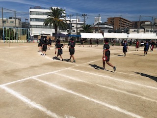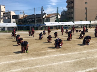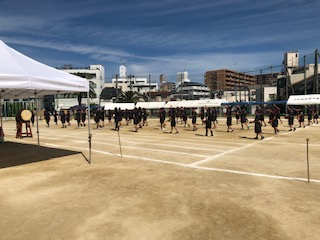 エイサーの演技をします。前に並ぶ児童は交代していきます。最後は前に並んでから退場します。