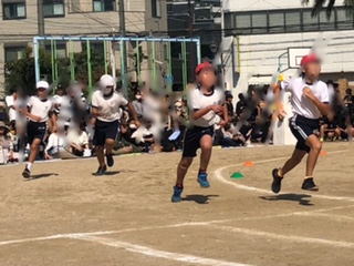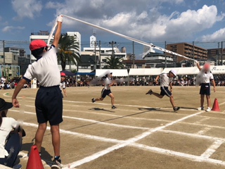 5年生、6年生の係の子どもたち(写真ではゴールテープを持っています。他にもたくさんの係があります)も活躍しています。
