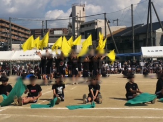 大トリは6年生の団体演技です。よさこいソーランの後は、フラッグ(旗)を持って隊形を次々に変えながら素敵な演技を披露していきました。