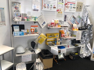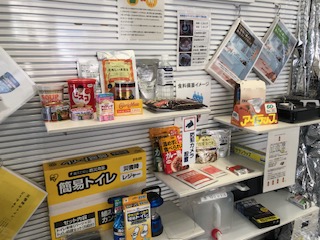 震災や台風などで救援物資が届かない間に必要な防災用品などの例が展示されています。
