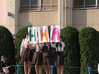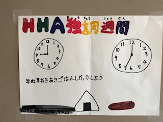 今週のHHA強調週間、廊下・階段の右側を歩こう週間について、給食委員会、代表委員会の子どもたちが工夫して発表しました。写真中のポスターも子どもたちが作成しています。