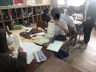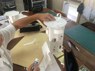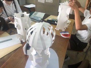 紙でタワーなどの建物を作っています。(写真は先週です)