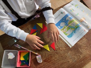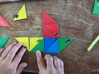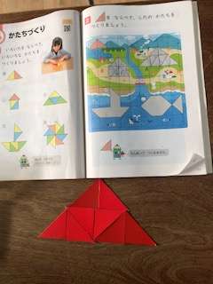 教科書の図形を色板を作って作っていきます。パズルのようで、なかなか難しいです。