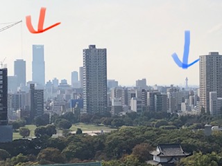 太陽の広場(写真上)、大阪城ホールとビジネスパーク(写真中)、写真下では、あべのハルカス(赤矢印)・通天閣(青矢印)もよく見えます。