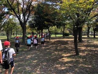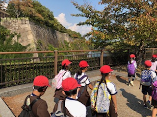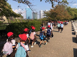 遠足ですので歩きます。大阪城公園内を歩いていきます。次はお弁当です。