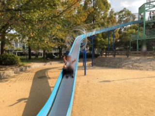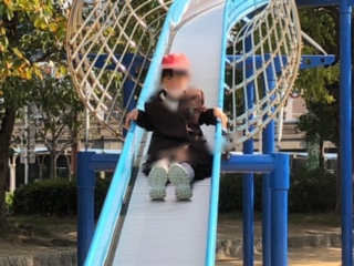 これはローラーのついたすべり台です。何回もすべっています。(スカートの下には体操ズボンを履いています)