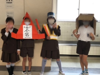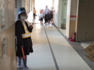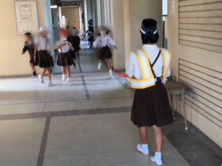 今週の、廊下・階段の右側を歩こう週間には、代表委員会の子どもたちが廊下に立っていました。服装も工夫しています。(写真は昨日です)
