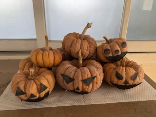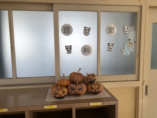 5年生が学習で栽培して観察したカボチャが実りました。ハロウィン風に展示しています。
