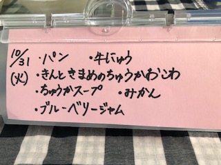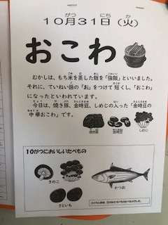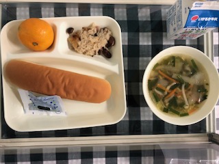 今日の給食は、おこわでした。金時豆が入った中華風です。みかんもつきました。