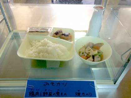 今日の献立は、みそカツ、鶏肉と野菜の煮物、焼きのり、ごはん、牛乳です。