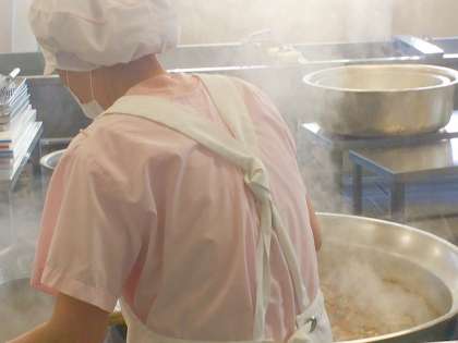 子どもたちの歌声が中庭に聞こえてきます。給食室からは、とても良い匂いがします。給食室を訪問したら、炊きたての、鶏肉と野菜の煮物を食缶に移しているところでした。写真から湯気と共に良い匂いが伝わりませんか?いつも温かく美味しい給食ありがとうございます。