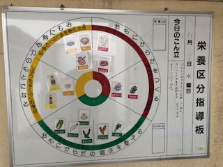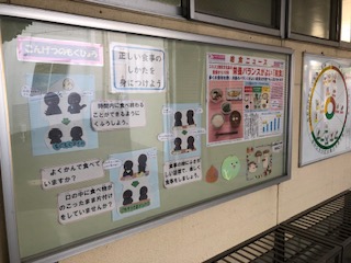 給食室には、今月の目標、栄養区分指導表、ニュースが掲示されています