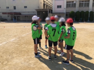 昨日の体育での様子です。チームでどのようにしたら速く走れるかを話し合っています。