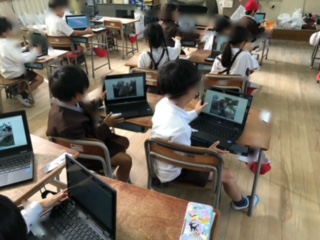1年生が端末を使っています。撮った写真を画面に映しています。