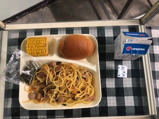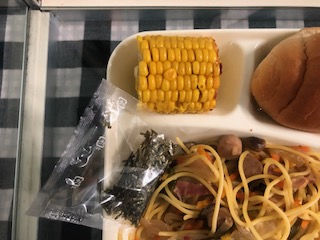 今日の給食は、和風スパゲティでした。のり、とうもろこし、チーズがつきました。