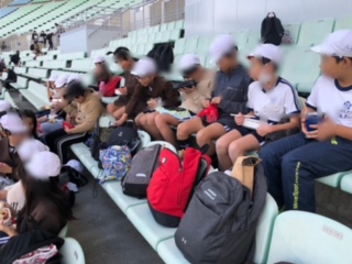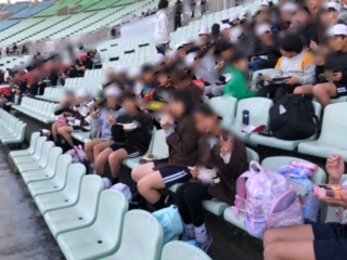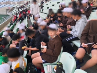スタジアムの席でお弁当を食べます。