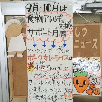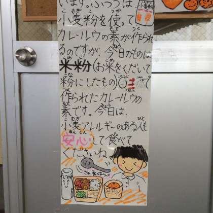 今日のカレールーは、米粉を使っています。先月に続いて、今月も食物アレルギー対応サポート月間のメニューです。小麦粉アレルギーの児童も安心して食べることができます。米粉のカレールーを使っています。