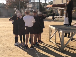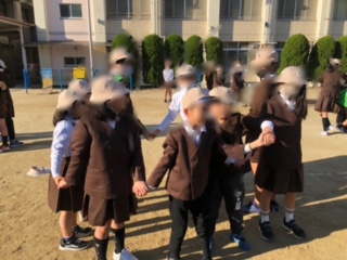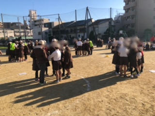 今日の児童集会は、人間知恵の輪です。たてわり班で手をつないで内側を向き、手をうまく抜けるようにして外側を向きます。