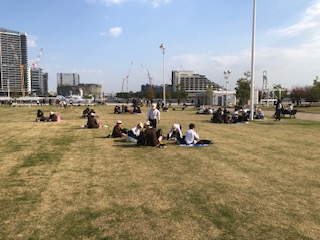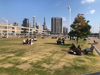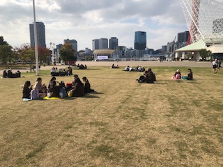 メリケンパークの芝生でお弁当です。さわやかな海風が吹いています。小春日和で日差しも快く感じられます。