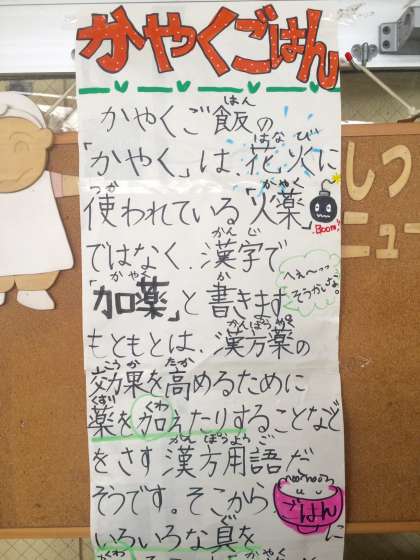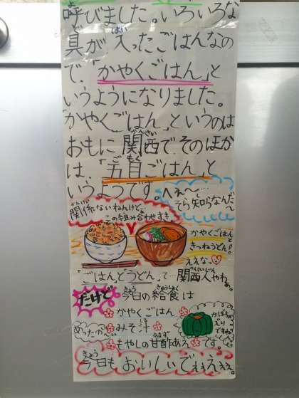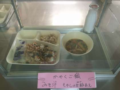 今日の献立は、かやくご飯、もやしの甘酢和え、味噌汁、牛乳です。