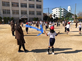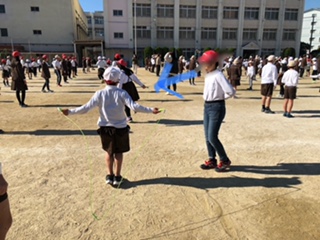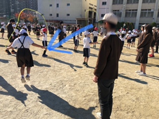 なわとびチャレンジ大会の低学年の部です。1年生と2年生のそばに5年生と6年生がついて、とんだ数を数えています。(青の矢印)