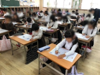 学力経年調査は3年生以上が受けます。調査を受けない1年生ではふだん行うテストをしていました。