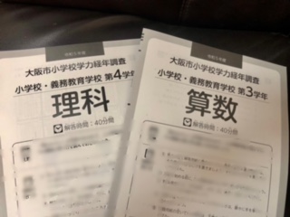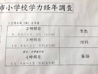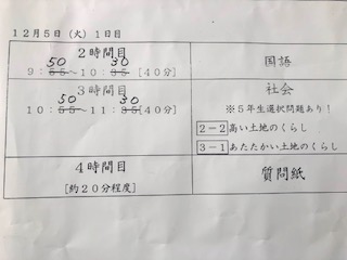 大阪市学力経年調査は大阪市立のすべての小学校で実施されます。教室の黒板には科目ごとの時間表がはられています。(写真は5年生)